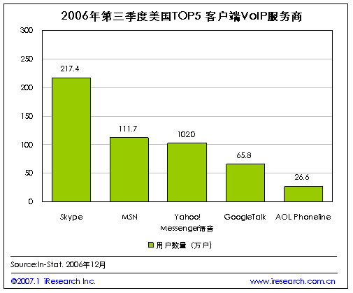 iResearch艾瑞市場(chǎng)咨詢根據(jù)In-Stat的統(tǒng)計(jì)數(shù)字整理發(fā)現(xiàn),目前在美國(guó)VoIP市場(chǎng)中,以客戶端為服務(wù)基礎(chǔ)的服務(wù)提供商的用戶數(shù)量來(lái)看,占市場(chǎng)主導(dǎo)位置的五大服務(wù)商為Skype、MSN、Yahoo、Google和AOL.到2006年第三季度為止,Skype的用戶已經(jīng)達(dá)到了217.4萬(wàn),排名第五位AOL Phoneline的用戶數(shù)量也有26.6萬(wàn)之多。