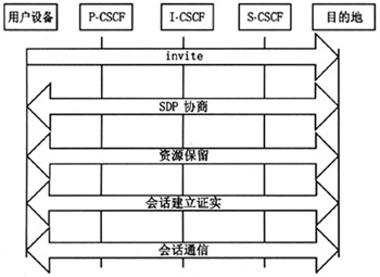 GPRS supporting node,GPRS服務(wù)支持節(jié)點(diǎn))和GGSN(gateway GPRS supporting node,GPRS網(wǎng)關(guān)支持節(jié)點(diǎn))到達(dá)CSCF,經(jīng)過處理后送往其他IMS網(wǎng)絡(luò)、MGCF/MGW網(wǎng)絡(luò)或外部IP網(wǎng)絡(luò)。在此過程中,SGSN和GGSN僅查看消息的目的IP地址,不分析消息的內(nèi)容,起到路由器的作用。圖6示出移動用戶發(fā)起呼叫的信令流程示例,此處假設(shè)用戶位于訪問網(wǎng)絡(luò)。用戶發(fā)SIP