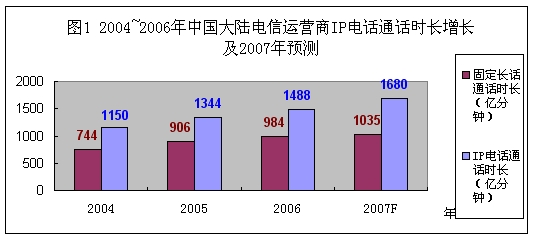 圖1:2004-2006年中國(guó)大陸電信運(yùn)營(yíng)商IP電話通話時(shí)長(zhǎng)增長(zhǎng)及2007-2008年預(yù)測(cè)。