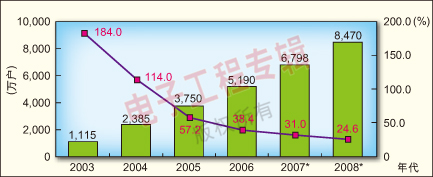 圖3:2003-2006年中國(guó)大陸寬帶用戶(hù)數(shù)量增長(zhǎng)及2007-2008年預(yù)測(cè)。