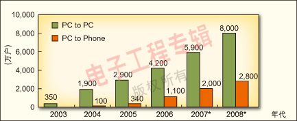 圖6:2003-2006年中國(guó)大陸VoIP用戶(hù)增長(zhǎng)及2007-2008年預(yù)測(cè)。