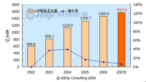從圖中可以看出,國(guó)內(nèi)IP電話(huà)市場(chǎng)近年呈現(xiàn)出快速增長(zhǎng)趨勢(shì),2002-2007年年均增長(zhǎng)率為20.7%。預(yù)計(jì)2007年IP電話(huà)的通話(huà)時(shí)長(zhǎng)將達(dá)到1567.6億分鐘,同比增長(zhǎng)7%。但從2005年開(kāi)始,IP電話(huà)的增長(zhǎng)率呈下降趨勢(shì),這主要是受管制限制和移動(dòng)長(zhǎng)途的替代作用所致。