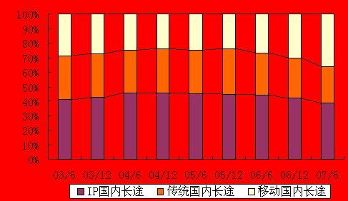 從圖中可以看出,IP電話(huà)的相對(duì)快速增長(zhǎng)在一定程度上對(duì)傳統(tǒng)長(zhǎng)途電話(huà)形成了替代作用,但近年來(lái)自于移動(dòng)長(zhǎng)途的替代作用更明顯。從占比上來(lái)看,2007年上半年,IP國(guó)內(nèi)長(zhǎng)途電話(huà)占全部國(guó)內(nèi)長(zhǎng)途通話(huà)量38.3%,超過(guò)移動(dòng)長(zhǎng)途電話(huà)的35.9%和傳統(tǒng)長(zhǎng)途電話(huà)的25.8%,仍然是長(zhǎng)途電話(huà)的主流。