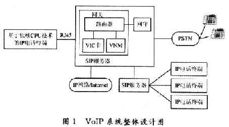 通過對(duì)國內(nèi)外VoIP技術(shù)的研究,要面向社會(huì)推廣價(jià)格低廉的IP電話業(yè)務(wù),普通用戶的電話終端成本,運(yùn)營(yíng)商的設(shè)備、管理成本都是必須考慮的因素。因此,設(shè)計(jì)出了一個(gè)VoIP系統(tǒng)方案,如圖1所示。