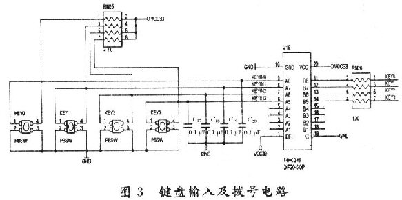 為實(shí)現(xiàn)IP電話與普通電話的通用性,該終端加入鍵盤模塊,按鍵開關(guān)KEY0~KEY9,KEY_X,KEY_Y,KEY_ON,KEY_OFF(其中,除KEY_ON和KEY_OFF是鎖閉式按鍵外,其余均為非鎖閉式按鍵)采用行列掃描式接法,加入了74HC245總線收發(fā)器作為緩沖器,電路如圖3所示(由于按鍵過多,圖中僅給出KEY0~KEY3電路)。