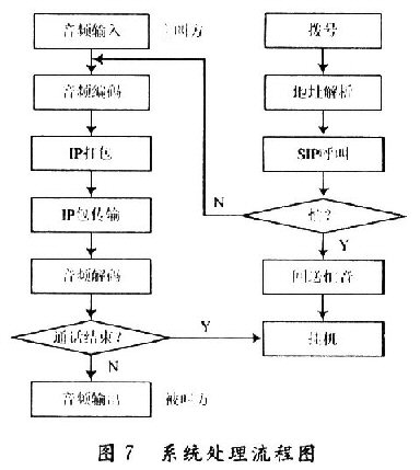 當(dāng)撥號(hào)確認(rèn)后,主控制器對(duì)編解碼器發(fā)送控制指令,開始語音A/D轉(zhuǎn)換,并進(jìn)行編碼,送到片外存儲(chǔ)器內(nèi)進(jìn)行緩存;Nios CPU對(duì)撥號(hào)信息的解析確定。目的地址,通過Avalon總線對(duì)以太網(wǎng)接口發(fā)送數(shù)據(jù)傳輸指令;將符合以太網(wǎng)標(biāo)準(zhǔn)的數(shù)據(jù)從片外存儲(chǔ)器內(nèi)讀出,送入Internet中,返回確認(rèn)信息。系統(tǒng)處理流程圖如圖7所示。