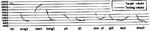 神經(jīng)網(wǎng)絡(luò)韻律模型同樣輸出了較好的音節(jié)音長參數(shù),圖5很好地反映出了語句音長的變換趨勢。由于在自然語句中,音節(jié)音長參數(shù)對控制音節(jié)發(fā)音的節(jié)奏和輕重起著非常重要的作用。我們對所有測試結(jié)果進行的統(tǒng)計表明,81%的音節(jié)輸出誤差在0~50ms,約14%的音節(jié)輸出誤差在50~120ms,而只有約5%的音節(jié)輸出誤差會超過120ms。從音長改變的百分比上看:89.8%的音節(jié),其音長輸出誤差占目標(biāo)音長的百分比在0~20%之間;另外,9%的音節(jié)輸出誤差百分比在20%~50%之間,而只有1.2%的音節(jié)輸出誤差百分比會超過50%。因此,該模型的音長參數(shù)輸出結(jié)果基本上滿足了較高質(zhì)量韻律控制參數(shù)的要求。
