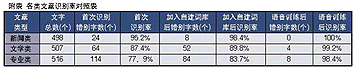 然后,我們又利用聲龍?zhí)赜械脑~匯生成器,讓聲龍自行辨別文章中的詞匯并自動添加到自建詞庫中,并針對其中的一些英文單詞或縮寫對聲龍進行語音識別訓練,之后我們再次錄入同一篇專業(yè)文章。結(jié)果非常令人滿意,從附表可以看出識別率有了明顯提高。最后,我們又錄入了另一篇相同領(lǐng)域的專業(yè)文章中的一段(512字)。首次錄入的錯別字有46個,識別正確率為91%。與第一篇文章相比,識別率有了明顯提高。