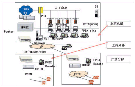分布式呼叫中心一般由總中心和分中心組成,它們之間可以是對(duì)等關(guān)系或隸屬關(guān)系,各中心分布于不同的地理位置,在運(yùn)作時(shí)間、資源、功能上互相協(xié)作,為用戶提供最大限度的服務(wù)。分布式呼叫中心在功能上的突出需求為:用戶打入的電話可以在各分呼叫中心之間轉(zhuǎn)接,即實(shí)現(xiàn)網(wǎng)絡(luò)ACD;不論用戶資料存放于何地理位置的數(shù)據(jù)庫(kù),它都應(yīng)能在電話被派到話務(wù)員座席時(shí),在來(lái)電信息中彈出,即實(shí)現(xiàn)遠(yuǎn)程數(shù)據(jù)訪問(wèn);具有響應(yīng)IP電話的能力,以處理通過(guò)IP網(wǎng)絡(luò)傳送過(guò)來(lái)的異地用戶呼叫或Web呼叫;呼叫排隊(duì)模塊應(yīng)具有較強(qiáng)的路由能力,以使異地用戶能直接被最適合的話務(wù)員接聽(tīng)。
