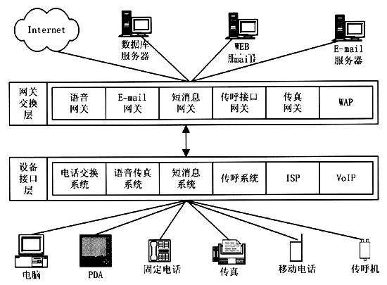 統(tǒng)一消息平臺集成了固定電話網(wǎng)、移動電話網(wǎng)和Internet網(wǎng)絡(luò)。目前,電話網(wǎng)和Internet網(wǎng)各自擁有獨立的網(wǎng)絡(luò)資源和信息服務(wù)領(lǐng)域,而這兩大網(wǎng)絡(luò)的用戶群存在著很大的交叉。電話的使用在中國已經(jīng)占有很高的普及率,傳統(tǒng)的160/168聲訊服務(wù)已經(jīng)成為中國百姓所熟悉的最具代表性的電話信息服務(wù),而Internet作為在中國剛剛興起的信息媒體,尚需要普通百姓逐漸認識它、使用它。統(tǒng)一消息平臺將電話網(wǎng)和Internet網(wǎng)結(jié)合在一起,極大地擴大了兩大網(wǎng)絡(luò)各自的用戶群,電話用戶可以用電話或者傳真獲取Internet上的信息,電子郵件服務(wù)也可以不局限于Internet,而能對廣大的電話用戶開放。統(tǒng)一消息平臺為用戶帶來的是信息的方便、及時,使人們在任何時間、任何地點都能夠獲取需要的信息。