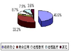 視頻會議系統(tǒng)在我國開始發(fā)展的初期,政府部門的應用就占據(jù)了重要位置,覆蓋中央到直轄市和各省會城市的國家公眾視頻會議骨干網(wǎng)已經(jīng)完工。自1994年9月投入使用以來,國務院等機關(guān)先后利用該網(wǎng)召開了三百多次全國范圍的可視通訊會議。整個系統(tǒng)運行情況良好,得到了國家領導人和各部委領導的高度贊揚。近年來隨著電子政務工程的逐步推進,政府部門更加關(guān)注視頻會議系統(tǒng)建設。在經(jīng)濟發(fā)達地區(qū)(例如浙江、山東、廣東),視頻會議網(wǎng)已覆蓋到地市級城市,有的甚至覆蓋到縣一級。除各級政府之外,其它諸如檢察院、法院、公安和和水利等職能部門也是視頻會議系統(tǒng)的重要用戶。如圖1所示,政府辦公已占全部市場份額的46.6%。
