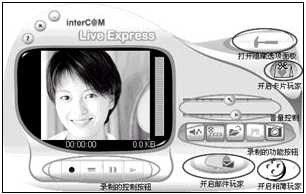 動(dòng)態(tài)視頻EMAIL,用這個(gè)軟件可以采用發(fā)送電子郵件的方式,將您的音容笑貌傳送到親朋好友的郵箱中,讓遠(yuǎn)方的她收到可“動(dòng)”的你。我們還是以?shī)W美嘉公司的CD370電腦相機(jī)為例向大家介紹這個(gè)功能。在CD370附帶的驅(qū)動(dòng)光盤中就搭載了視頻EMAIL的制作軟件,其實(shí)它是Intercom的Live Express視頻應(yīng)用軟件,除了視頻EMAIL(郵件玩家)的功能外,它還具有“卡片玩家”及“相薄玩家”等功能,我們將在以后的文章中為大家逐一介紹。首先,打開Live Express的主程序“影音玩家”,可以見到程序界面上分布著大大小小不同的按鈕,是不是一時(shí)間找不到感覺了?不用著急,下面請(qǐng)跟著我的步驟來(lái)操作: