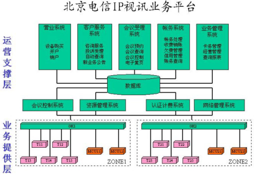 在整個(gè)運(yùn)營支撐層的系統(tǒng)中,主要包括四大系統(tǒng),即會議控制系統(tǒng)、資源管理系統(tǒng)、認(rèn)證計(jì)費(fèi)系統(tǒng)、網(wǎng)絡(luò)管理系統(tǒng)。除此之外,還有其它幾個(gè)輔助系統(tǒng),包括營業(yè)系統(tǒng)負(fù)責(zé)為客戶開戶和銷戶,終端注冊等處理;客戶服務(wù)系統(tǒng)提供咨詢服務(wù)、投訴受理、自動查詢和幫助客戶進(jìn)行會議預(yù)約,在資源不足的情況下進(jìn)行會議調(diào)度等;會議受理系統(tǒng)是面向客戶提供會議電視業(yè)務(wù)預(yù)約、會議狀態(tài)查詢、會議控制服務(wù),由用戶自助完成預(yù)約會議和控制會議的操作;賬務(wù)系統(tǒng)負(fù)責(zé)賬務(wù)方面的管理,包括賬務(wù)管理,收費(fèi)銷賬,催繳欠費(fèi)、銀行繳費(fèi)等;業(yè)務(wù)管理系統(tǒng)主要是記賬卡的卡務(wù)處理、經(jīng)營管理、查詢報(bào)表等。