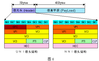 ATM信元實際上就是分組,為區(qū)分X.25分組(Packet)改稱為信元(Cell)。ATM信元具有固定的長度,總長為53字節(jié)。其中前5個字節(jié)為信頭(Header),包含各種控制信息,包括信元目的(邏輯)地址、糾錯碼、業(yè)務控制和維護信息等;后面48字節(jié)為信息字段(Payload),又稱凈荷,其中包含了業(yè)務的數(shù)據(jù),它們將被透明地傳輸。信元結構如下圖6所示。在UNI接口和NNI接口上ATM的信元頭結構是不同的。