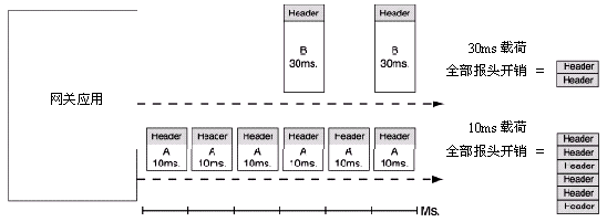 在一個(gè)減少發(fā)話方和受話方間音頻反應(yīng)時(shí)間的努力中,VoIP網(wǎng)關(guān)通常會(huì)配置成發(fā)送較小的語(yǔ)音數(shù)據(jù)載荷。雖然這樣做通?梢詼p少聽得見的傳輸延遲,但同時(shí)也增加了一個(gè)給定語(yǔ)音數(shù)據(jù)流需要傳遞的包的數(shù)量。因?yàn)椴还芏嘈〉囊纛l載荷都需要一個(gè)固定大小的包報(bào)頭,網(wǎng)上需要傳遞的數(shù)據(jù)量越大這個(gè)效果越明顯──跟隨的是網(wǎng)絡(luò)包和數(shù)據(jù)流量的相應(yīng)增長(zhǎng)。圖1說明了用于傳輸包報(bào)頭的帶寬會(huì)隨著包載荷大小的縮小而增大。