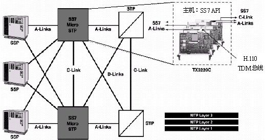 微型STP連接多條從SSP來的鏈路,并把它們集中到一個(gè)連接STP的鏈路集之中,這一鏈路集有兩條鏈路。微型STP到每個(gè)SSP也有兩條鏈路組成的一個(gè)鏈路集。微型STP由完全相同配置的一對構(gòu)成,以實(shí)現(xiàn)高可用性和高可靠性,兩個(gè)STP之間用交叉鏈路(C鏈路)相連接。另外,微型STP上的每個(gè)端口可以設(shè)置一個(gè)唯一的信令點(diǎn)編碼,以便移除SS7鏈路時(shí)不影響端點(diǎn)SSP。
