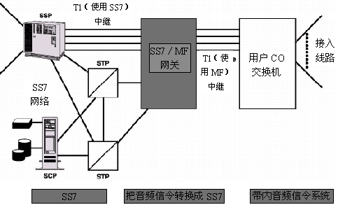 如圖14所示,SS7/MF網(wǎng)關(guān)可以實(shí)現(xiàn)SS7信令到MF(多頻)信令的轉(zhuǎn)換,使現(xiàn)有MF信令交換機(jī)無須升級就能擁有SS7信令能力。混合了SS7和基于音頻信令的呼叫建立環(huán)境能為各種運(yùn)營商經(jīng)濟(jì)實(shí)用的SS7網(wǎng)絡(luò)接入方案,采用這一方案的有蜂窩電話運(yùn)營商、本地電話運(yùn)營商、長途電話運(yùn)營商和其它一些仍使用舊式交換機(jī)的電話運(yùn)營商。