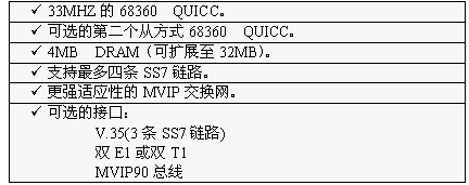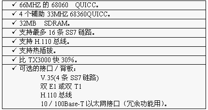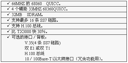 TX3000卡的功能大致和TX2000卡相同,但它比TX2000的性能2.5至5倍。TX3000卡上有一個(gè)66MHZ的68060協(xié)處理器。TX3000卡為SS7應(yīng)用配置1至4個(gè)QUICC通信控制器,最多16條信令鏈路,提供一個(gè)三口V.35,擁有雙T1或雙E1接口。(主板上標(biāo)準(zhǔn)配置一個(gè)QUICC,支持四條SS7鏈路,當(dāng)CT總線和串行接口都要使用,或者處理的鏈路超過4條時(shí),可先配置有三個(gè)QUICC的背板,四個(gè)QUICC可支持16條SS7鏈路)。