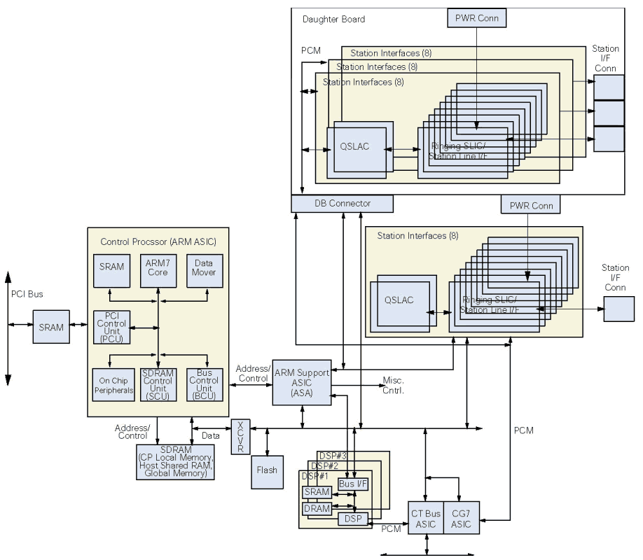 每個(gè)板卡包括三個(gè) Motorola 563xx DSP. DSP 子系統(tǒng)包括SRAM, 某些情況下有DRAM. DSPs 直接有PCM連接到CTbus ASIC, 它提供SCbus/CTbus(H.100)和模擬座席接口之間PCM交換的功能.