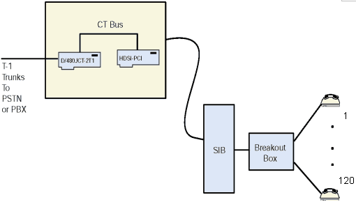 Bus,一個(gè)HDSI/1200座席卡可以連接到一個(gè)Dialogic® Dialogic® D/480JCT-2T1板卡和一個(gè)T-1板卡,建立一個(gè)120-station-×-48-trunk交換環(huán)境。應(yīng)用可以使用CT