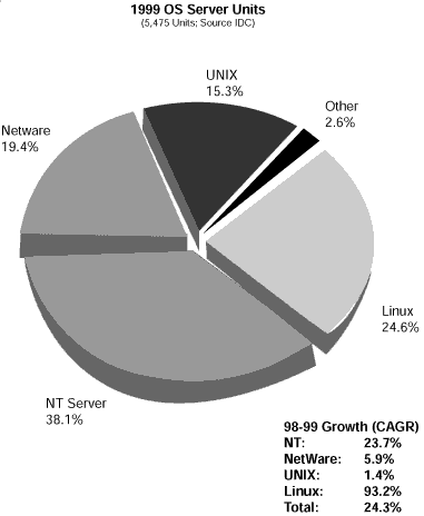 而且,在1999年Linux服務(wù)器增長(zhǎng)率大約在98.3%,遠(yuǎn)遠(yuǎn)超過(guò)居于第二位的Windows的24%的增長(zhǎng)率。