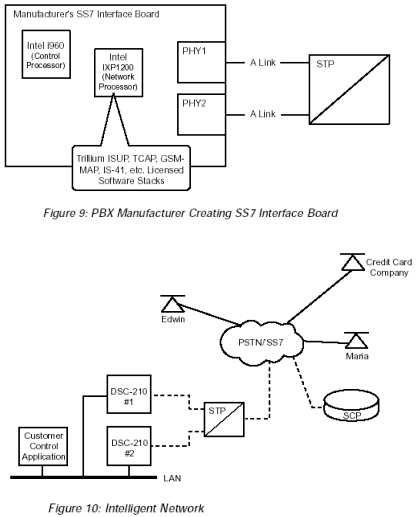 SS7產(chǎn)品可以被用來(lái)建立SS7網(wǎng)絡(luò)元素(NEs)和高級(jí)智能網(wǎng)絡(luò)(AIN)平臺(tái),比如: