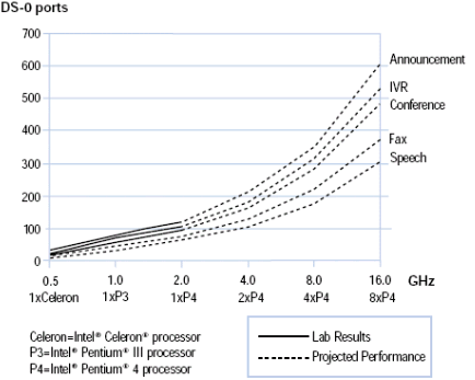 在奔騰處理器上引入DSP能力使得開發(fā)主機(jī)媒體處理功能非常高性價(jià)比. 根據(jù)初步的預(yù)測, Dialogic估計(jì)HMP軟件讓一個(gè)1GHz的奔騰處理器可以代替兩顆150MHz的DSP.