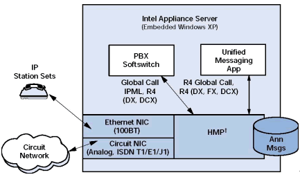 PBX 應(yīng)用可以被實(shí)施在一個(gè)低成本的Dialogic應(yīng)用設(shè)備或一個(gè)使用Dialogic處理器的普通臺式計(jì)算機(jī)上. 最終用戶可以根據(jù)需要選擇平臺.