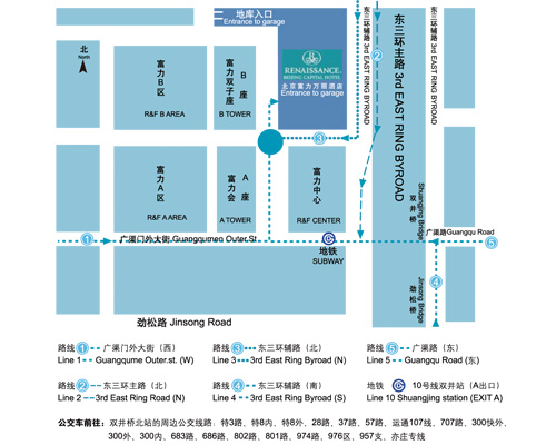 場館交通信息 名 稱:北京富力萬麗酒店 Renaissance Beijing Capital Hotel 公 交:特3路/特8外環(huán)主路/特8快車內(nèi)環(huán)/特8內(nèi)環(huán)主路/特8快車外環(huán)/特8外環(huán)/特8內(nèi)環(huán)/28路/7區(qū)間(高峰車)/37路/57路/運通107線/214夜班/300內(nèi)環(huán) 300快車內(nèi)環(huán)/300快車外環(huán)/300外環(huán)/348路/683路/686路/707路/801路/802路/974路/976區(qū)間 雙井橋北站下車 地 鐵:10號線雙井站下