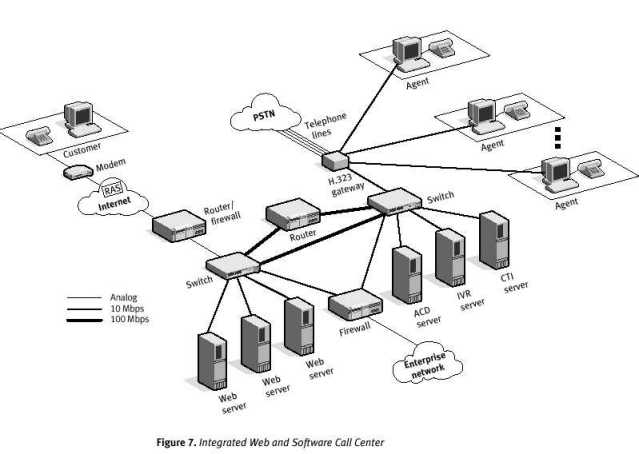 向基于軟件的呼叫中心模型遷移的第一步:通過使呼叫中心具有Web能力,將來自因特網(wǎng)的呼叫接入到現(xiàn)有呼叫中心中。圖5展示了H.323網(wǎng)關如何轉換VoIP呼叫到現(xiàn)有自動呼叫分配器(ACD)支持的傳統(tǒng)電話呼叫。這一簡單步驟,使公司能夠通過基于因特網(wǎng)的電話連接客戶。然而,在客戶所見到的Web頁面和業(yè)務代表的Web內(nèi)容及CTI數(shù)據(jù)之間,通常既沒有邏輯連接,也沒有物理連接。(CTI數(shù)據(jù)的獲得可能會通過在客戶的瀏覽器上下載一個代理或一個JAVA小程序?qū)崿F(xiàn),通過它發(fā)出客戶的位置等相關數(shù)據(jù))。因此在大多數(shù)情況下,客戶和業(yè)務代表在購買或支持過程中通過交談而解決問題。